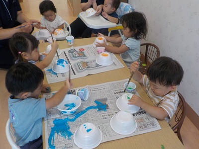 手作りヨーヨーは、お祭りに向けて、絵の具で可愛く製作しました