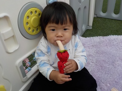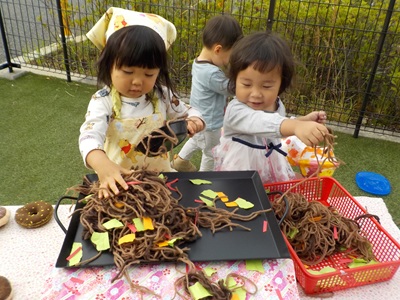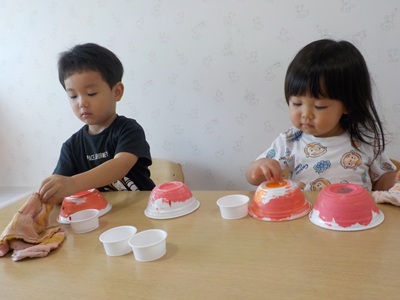 今日は危険の無い様に、サークルの中で手作りの作品の感触をを一緒に楽しみました