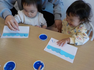 ウロコに見立てて、指スタンプをペタペタ・・・・👉
