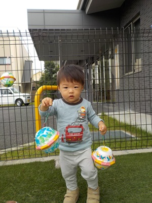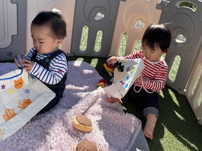 今日は危険の無い様に、サークルの中で手作りの作品の感触をを一緒に楽しみました