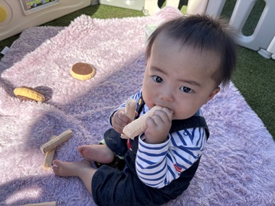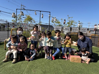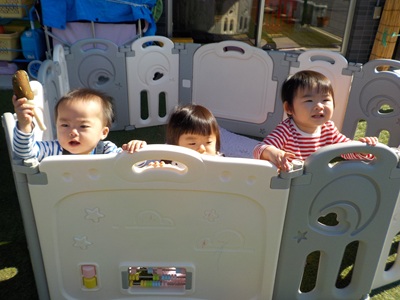 0歳児クラスのお友だち3名も今日は、園庭で日光浴をしながら参加しました!!