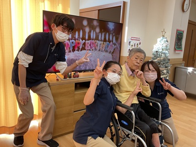 ハッピーバースデイ♪のお歌を皆さんで歌い、ご入居者様を代表して