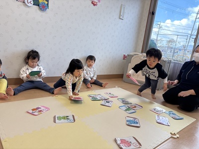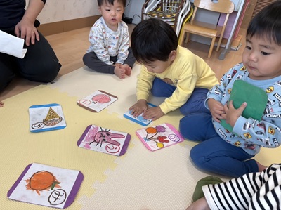 保育士が一緒になって、「はーーーい!!✋」と絵カードを取るうちに