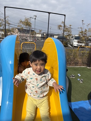 給食をいっぱい食べて、お昼寝をして夕方は、園庭でも楽しく遊びました